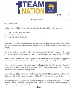 Sri Lanka Cricket has decided to lift the one-year suspension imposed on Danushka Gunathilaka, Kusal Mendis and Niroshan Dickwella: from playing International Cricket, across all three formats, with immediate effect.