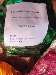 صدر پاکستان ہاکی فیڈریشن برگیڈیئر رخالد سجاد کھوکھر کی جانب سے اولمپکین مطیع اللہ خان کی صحت یابی پر پی ایچ ایف وفد نے تہنیتی پیغام پہنچایا اور اس موقع پر صدر پی ایچ ایف برگیڈیئر رخالد سجاد کھوکھر نے اولمپین مطیع اللہ خان سے بذریعہ ٹیلی فون بات بھی کی۔