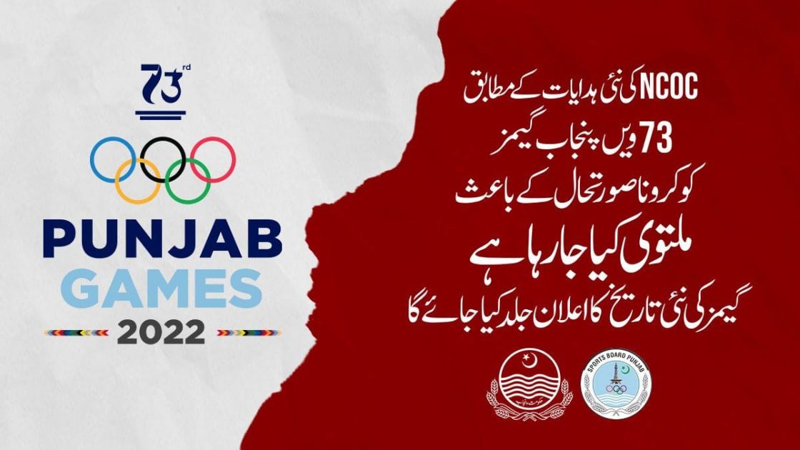 NCOC کی ہدایات اور کرونا کی صورتحال کے پیش نظر 73 ویں پنجاب گیمز کو ملتوی کرنے کا فیصلہ کیا ہے۔