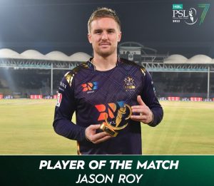 205 رنز کے تعاقب میں کوئٹہ گلیڈی ایٹرز کے اوپنر جیسن رائے نے کریز سنبھالتے ہی جارحانہ انداز اپنایا اور شاہین شاہ آفریدی، زمان خان، حارث رؤف اور راشد خان پر مشتمل باؤلنگ اٹیک کو میدان کے چاروں اطراف زبردست شاٹس لگا کر دباؤ کا شکار کیا۔ 20 گیندوں پر نصف سنچری اسکور کرنے والے جیسن رائے نے 57 گیندوں پر 116 رنز کی برق رفتار اننگز کھیلی۔ ان کی اننگز میں 8 چھکے اور 11 چوکے شامل تھے۔