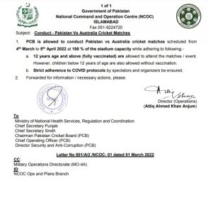 اس حوالے سے این سی او سی نے وفاق، صوبوں پی سی بی کو مراسلہ ارسال کر دیاہے. جس کےمطابق مکمل ویکسینیٹڈ افراد کو سٹیڈیم میں میچ دیکھنے کی اجازت ہو گی. تمام عمر کے افراد سٹیڈیم میں پاک آسٹریلیا میچز دیکھ سکیں گے. سٹیڈیم میں آنے کیلئے 12 سال سے زائد عمر کی ویکسینیشن لازم ہو گی. بارہ سال سے کم عمر بچے بغیر ویکسینیشن سٹیڈیم آ سکیں گے. انتظامیہ، تماشائیوں کیلئے سٹیڈیم میں کورونا ایس او پیز پر عملدرآمد لازم ہو گا.