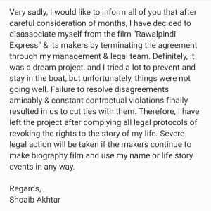 رواں برس جولائی میں پاکستان کے سابق فاسٹ بولر شعیب اختر نے اپنی زندگی پر فلم راولپنڈی ایکسپریس بنائے جانے کی تصدیق کی تھی۔ فلم کے لکھاری قیصر نواز جبکہ ہدایت کار محمد فراز تھے.