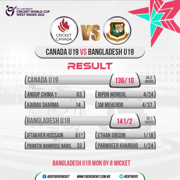 ڈھاکا(سپورٹس لیکس) ویسٹ انڈیز میں جاری انڈر 19 کے ورلڈ کپ کے میچ میں بنگلہ دیش نے کینڈا کو یک طرفہ میچ میں 8 وکٹوں سے شکست دےدی ہے. کینڈا نے ٹاس جیت کر پہلے بلے بازی کا فیصلہ کیا مزید پڑھیں